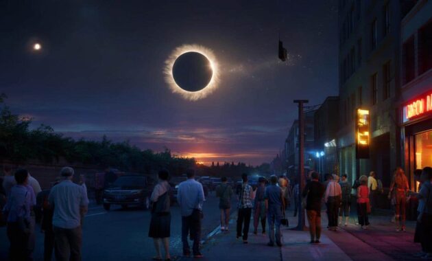 At 11:26 a.m., the city suddenly goes quiet. A dog that had been barking at a scooter stops mid-woof. The supermarket neon tube over the sidewalk flickers on by itself, as if some invisible hand had twisted a giant dimmer switch in the sky. You look up and the light is wrong—too cold, too flat, like someone put a filter over the day. Then, almost without warning, the sun disappears behind a perfect black disc and the crowd around you exhales in one single, hushed sound.