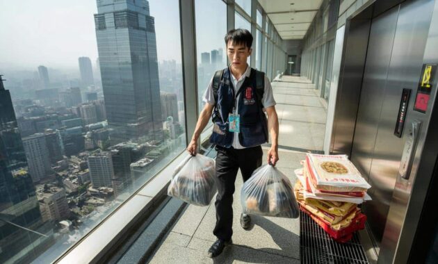 This strange in-between worker exists because the last few dozen floors of a mega-tower are a logistical nightmare. Delivery riders lose precious minutes queuing for lifts. Office staff don’t want to go down 40 floors to pick up a burger.