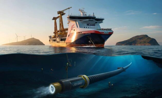 Nexans is deploying some of the most advanced cable‑laying vessels in service, including the Nexans Aurora. This 149‑metre-long specialist ship can carry over 10,000 tonnes of cable and is fitted with dynamic positioning systems, remotely operated vehicles and subsea trenching tools.