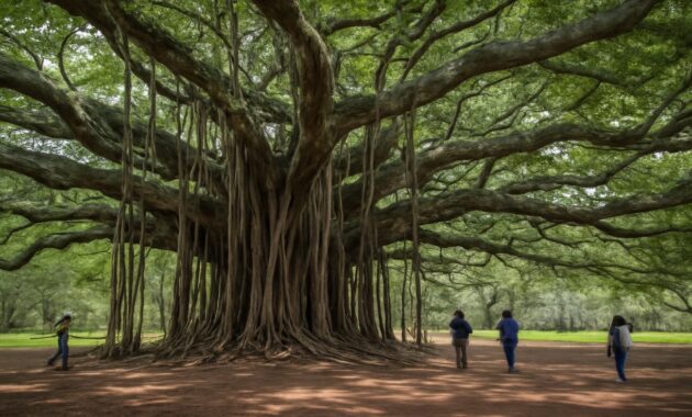 The tree has been guided to grow outward rather than only upward. Branches are bent, supported, and sometimes allowed to root where they touch the ground, creating new upright stems. Over decades, this produces a vast, low, spreading canopy that can blanket an area larger than a football field.