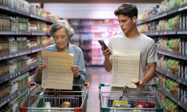 Behind her, a teenager sighs, eyes glued to his phone, earbuds in, contactless card ready. She has a paper list, folded and refolded, with every item ticked in blue ink. He scrolls his notes app and mutters that his battery is dying. Two worlds in the same aisle, bumping trolleys, silently judging each other.