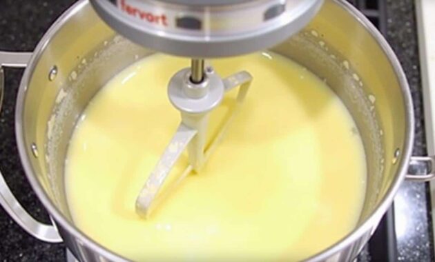 - Add the sugar and whisk again, so crystals dissolve instead of forming “pearls” with the yolks.