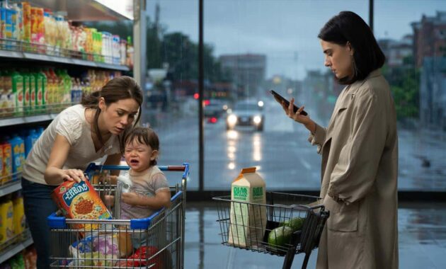 On a rainy Sunday in a crowded supermarket, a toddler screams near the cereal aisle while their exhausted mother negotiates over chocolate puffs. Just a few meters away, a woman in her thirties scrolls through her phone, reading an article about climate collapse and overpopulation, a carton of oat milk and a single avocado in her basket.
