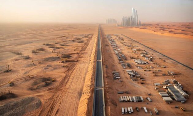 On recent high‑resolution satellite shots, the same corridor is a vast strip of raw ground. A continuous trench, in some places hundreds of meters wide, slices across the desert. Darker patches suggest poured concrete, while other zones are just graded sand waiting for foundations that haven’t arrived yet.