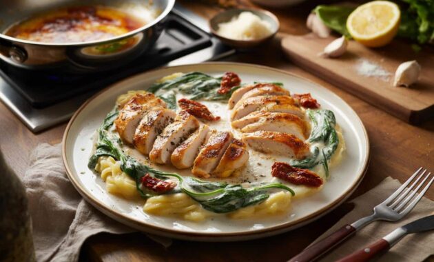 Yet this restaurant-level drama comes from a very ordinary cast: chicken, cream, garlic, tomatoes, spinach. No special tools, no exotic shopping list, no culinary diploma hanging above the stove. Just a hot pan and a bit of confidence.