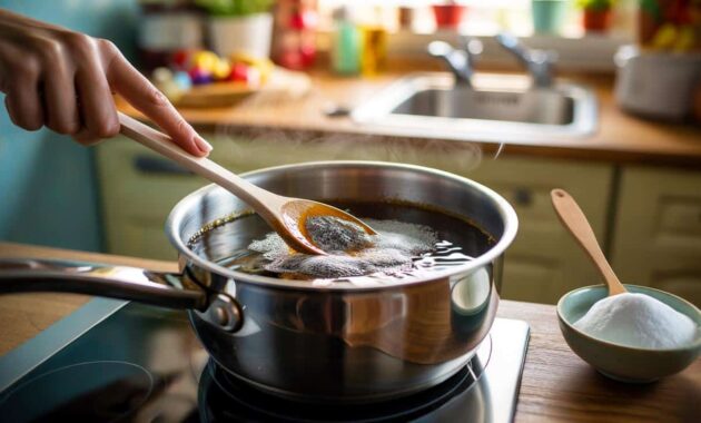 Fill the burnt pan with enough water to cover the black sugar layer by about a finger. Sprinkle in a generous tablespoon of baking soda (two if the situation is dire). Put the pan back on the hob and bring it to a slow boil. Let it simmer 5–10 minutes, nudging the crust occasionally with a wooden spoon. You’ll see the sugar start to lift in soft flakes, like it’s finally letting go.
