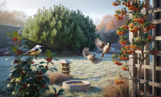 Give small birds three things in winter: thick cover to vanish into, bright berries to raid, and an evergreen roof that slows the wind.