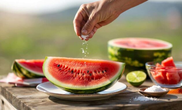 You’re sitting at a picnic table, paper plate flexing dangerously in one hand, a wedge of watermelon dripping down the other. Someone next to you reaches into the salt shaker, gives your bright red slice a casual sprinkle, and bites in like it’s the most normal thing in the world.