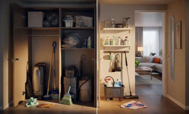 There’s a common trap: we want a “Pinterest-perfect” cleaning closet. Labels, matching bottles, color-coded cloths. The dream. Then we buy containers, stack them, and end up with a beautiful, totally unusable wall of stuff. Everything is too packed, too staged, too precious.